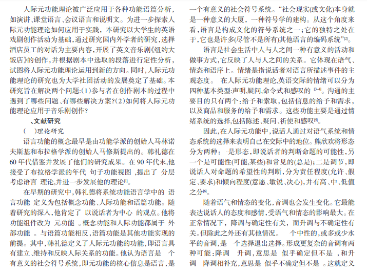 音乐剧是戏剧表演中的一种舞台表现形式,而音乐剧剧本是功能语篇中一种特殊的文体,其中包含剧中人物的对话、独白、旁白、舞台指示和唱词等内容,而英语文本写作能力是英语专业本科学生在学习英语的过程中必须具备的一项专业能力。人际元功能是韩礼德系统功能语言学中所提到的语言的三大元功能的重要组成部分。本文基于高校音乐剧社团组织的音乐剧《纽约大饭店》的剧本选段写作活动,对于大学生创作出的剧本文本进行人际元功能视角分析。本文从理论和实际应用的角度探讨了在人际元功能视角下进行音乐剧剧本的分析活动,以及其各要素如何应用于音乐剧剧本创作。试图尝试人际元功能理论在更丰富类型文本中的应用,以期给英语学习者一定的启示。
