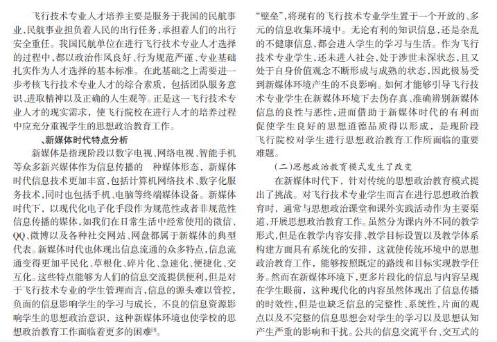 在新媒体时代背景下,微信、微博等成为开展信息交流与信息获取的主要方式。飞行技术专业人员担负着国家航空事业的发展重任,他们在工作以后担负着广大人民群众的生命安危重任。面对新媒体环境,如何对新时代的专业人才进行思想政治教育,是现阶段飞行院校所面临的重要挑战,也是社会构建领域所关注的重要问题。本文结合新媒体时代内涵进行分析,为现阶段飞行院校思想政治教育工作的开展提供一些有价值的参考。