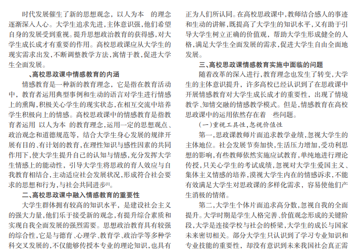 当前,我国教育理念正在经历改革,“以人为本”是开展大学生思想政治教育的重要原则,情感教育逐渐引起重视,然而在实践中也存在一些问题。针对在高校思政课教学过程中融入情感教育方面遇到的问题,我们有必要采取相应的措施来推动高校思政课中情感教育的实现。促进大学生知情合一、更新教育者的教育理念、推动评价结构合理化、提高教育者的综合素质、丰富教学实践活动有利于推动情感教育在高校思政课中更好地实现,提升思政课的实效性。