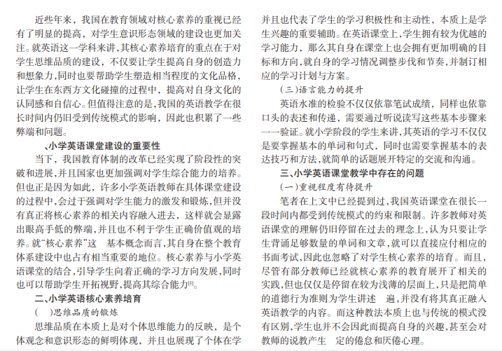 在语言文化交流和素质化教育深度融合的大背景下,当下国家在宏观上对课堂教学的要求也逐渐从传统的模式中脱离出来,不再以简单的背诵为核心,而是更加强调核心素养的培育。这种变化也给学校教学改革提供了新的思路和途径———持续性推进素质教学模式的应用。特别是就小学阶段的学生而言,尤为强调对其核心素养的启蒙和引导。本文将以小学英语课堂为出发点,重点论述基于学生核心素养培养的英语教学策略。
