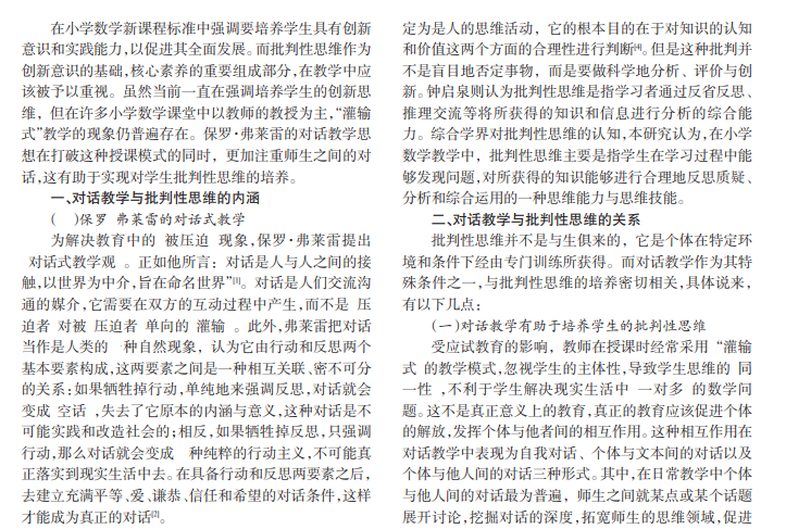 本文以保罗·弗莱雷的对话教学思想为依托,通过阐述对话教学和批判性思维的内涵,寻找二者之间的关系。并结合具体教学片段,探索出在小学数学教学中创设对话环境、保留对话空间、训练思维技能均是促进学生批判性思维形成的有效途径。