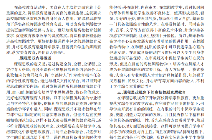 高校承担着培养合格社会主义建设者、接班人的重要使命,课程思政视角下的高校在课程设置方面需要重视提升其专业性与思政性,发挥课程教学所具备的育人作用。舞蹈教学作为高校美育的重要内容,有着德化人心的重要功效。将课程思政理念融进高校舞蹈教学,有助于推动立德树人任务的落实,并为人才培养提供充足动力,以促进学生健康、全面成长。本文阐述课程思政的内涵,并分析舞蹈教育所具备的育人功能,研究课程思政视角下高校舞蹈素质教育实践的对策。