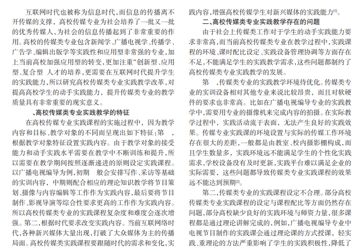 本文针对高校传媒类专业的实践教学改革进行研究,首先介绍了高校传媒类专业实践教学根据教学对象特点设置实践内容和根据时代要求改变实践内容的特征,而后分析了当前高校传媒专业实践教学环境待优化、实践课程设定不合理、实践设备管理协调不规范的问题,最后提出了优化传媒实践环境、培养“双师型”人才、创新传媒实践教学新方法、扩展传媒实践的教学课堂、完善传媒实践管理的建议,从而提升高校传媒专业实践教学的质量。