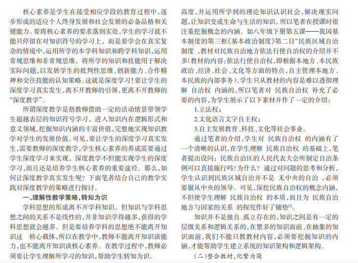 深度教学不但能实现学生的深度学习,而且还是培养学生核心素养的重要途径,笔者以部编教材八年级《道德与法治》为例,结合自身的教学实践,探讨实现“深度教学”的策略。