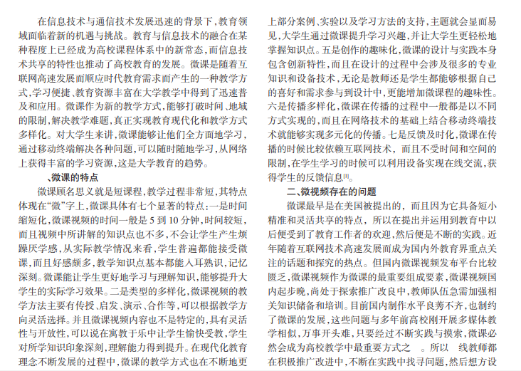随着计算机技术的不断发展和普及,其在我国的各个领域中已经得到了广泛的利用并发挥出重要价值。高校积极地将计算机技术与教学融合,并衍生出了微课这种新型的教学方式。本文从微课的特点、微视频存在的问题、高校微视频的设计策略、高校微视频的实践途径这几个方面展开讨论,并提出个人的见解。