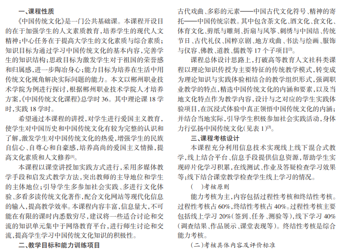 《中国传统文化》是一门公共基础课。本课程开设目的在于加强学生的人文素质教育,培养学生的现代人文精神。本文以郴州职业技术学院为例,根据教学改革要求,对高职院校开设的《中国传统文化》课程从课程性质、教学目标、训练项目、课程考核、教学效果等方面进行探究。