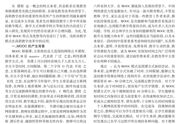 在信息化快速发展的背景下,借助互联网优势,线上教学模式应运而生。MOOC针对在传统教学工作中所出现的师资力量不足、教学授课标准不一问题,能够有效地解决。如果借助 MOOC优势,对教学手段和教学方式进行深化改革和调整,可在一定程度上有效提升教学水平。因此,研究 MOOC引领高职院校教学和课程改革具有积极的社会意义。