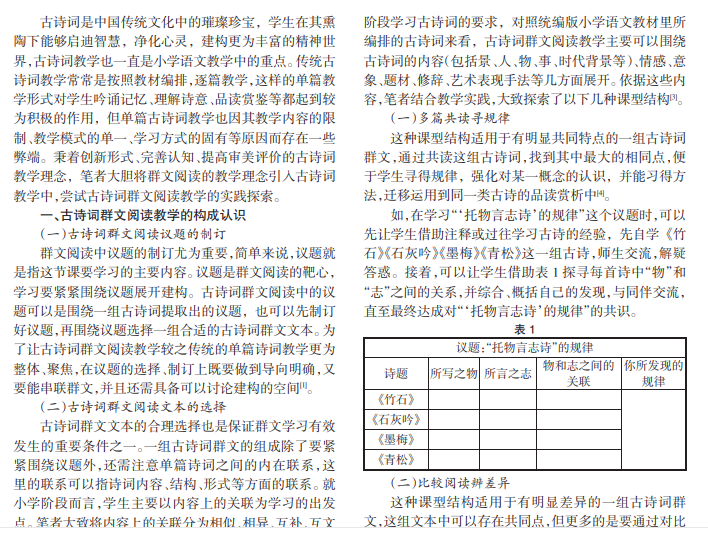 古诗词群文阅读教学以全新的教学理念,革新了学生的学习方式,提升了学生的思维品质,致力于帮助学 生提高学习古诗词的兴趣,丰富古诗词的积累,完善对古诗词的认识,提高对古诗词的审美,以期真正继承和弘扬中国 传统诗词文化。本文初步对小学古诗词群文阅读教学进行探索。