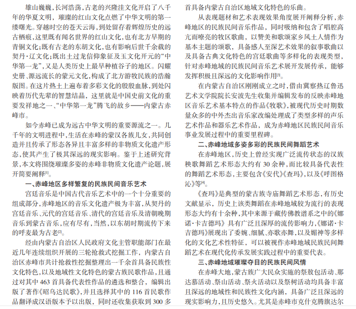 非物质文化遗产的保护与传承是关系文化大国建设的重要方面,搞好这项工作对于民族文化的保护、开 发,继承与创新以及增强我国的软实力都具有重要意义。本文围绕璀璨多姿的赤峰非物质文化遗产论题,择取五个具 有赤峰地域特色的典型非物质文化遗产进行简要阐释。