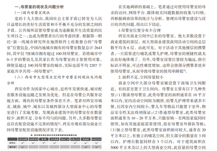 如今,商业空间中携婴的年轻父母,关于哺乳或婴儿护理等行为活动,大多倾向于在母婴室里操作。然而, 当今城市大型商业空间中已有的母婴室,其服务容量及功能设施并不能满足携婴者和婴儿的综合需求。就此问题,本 文选取了母婴室类型中的独立型母婴室为研究对象,通过对西安市大型商业空间母婴室的实地调研,从母婴室的空间 布局、功能设施、人性化服务方面进行分析,寻找满足需求的关键点,并提出设计建议。