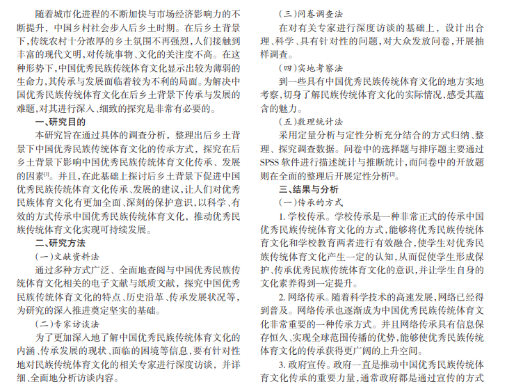 为了推动中国优秀民族传统体育文化的传承与发展,本文采用文献资料法、专家访谈法、问卷调查法、实 地考察法、数理统计法相结合的研究方法对后乡土背景下中国优秀民族传统体育文化展开调查研究,通过对调查结果 的整理、分析,发现中国优秀民族传统体育文化主要通过学校传承、网络传承、政府宣传与传承人传承这几种方式实现 传承,同时其传承、发展也面临着传承氛围消失、传承管理制度不完善、民族体育产业发展缓慢的困境。