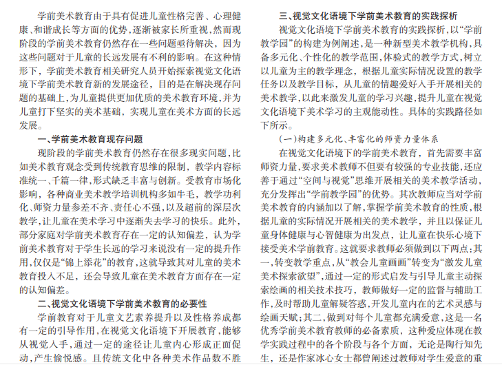 随着教育行业的快速发展,学前教育受到了更多的重视。在视觉文化语境下,能够针对现阶段学前美术教 育中存在的短板问题,构建一种多维度多层次的学前美术教育体系,为学生提供一个更加优质的学前美术学习环境。 文章就视觉文化语境下学前美术教育的实践进行探析并展开论述。