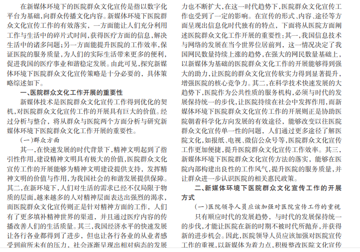 我国的医疗行业比较重视群众文化的宣传工作,多数医院都拥有自身的群众文化宣传通道。但随着时代 的发展,人们的诉求发生了变化,传统的医院群众文化宣传模式已经无法满足人们的需求,为提高医院的工作效率与质 量,新媒体应运而生。在新媒体环境的影响下,医院群众文化宣传工作得到极大改变,对消除宣传单一性等问题有显著 效果。基于此,本文将对新媒体环境下医院群众文化宣传策略展开研究。