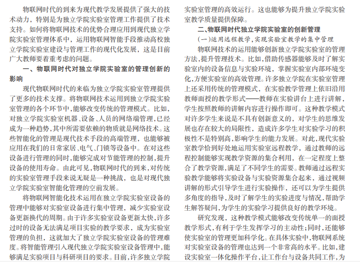 从现代社会发展对技术人才的要求来看,独立学院在人才培养上具有较大的优势。特别是进入 21世纪, 物联网技术发展为独立学院实验室教学发展提供了良好的条件,物联网技术能够促进独立学院实验室管理创新与完 善。对此,本文进一步研究物联网时代独立学院实验室管理创新的策略。