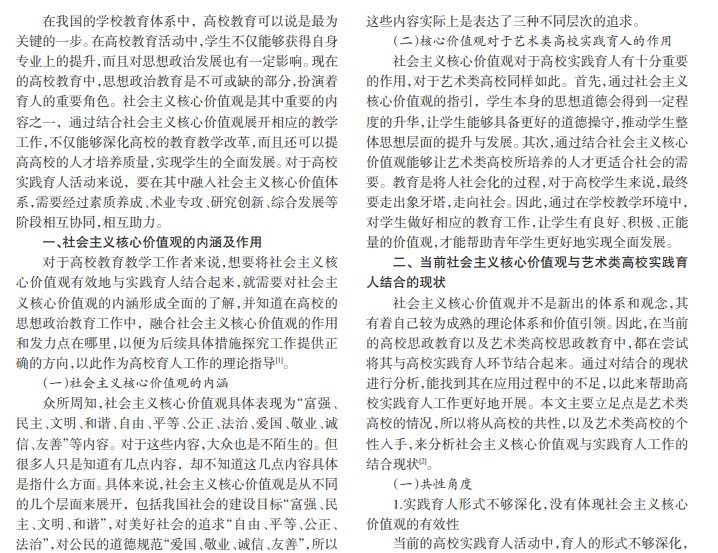 社会主义核心价值观是我党综合国家的发展前景、社会的发展需要、个人的自我成长等角度而提出的。在 社会主义核心价值观融入高校学生思想政治教育的过程中,强调对学生思想上的教育和引导工作。同时,高校也是社 会主义核心价值观意识内涵教育工作的最佳阵地。本文立足艺术类高校教育教学现状,对社会主义核心价值观视域下 艺术类高校实践育人体系构建展开分析和研究。