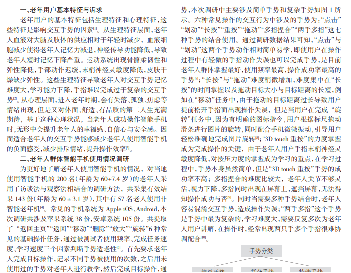 本着“以人为本”的设计理念,本研究通过了解老年人行为特征和心理特殊状态,对比老年人与年轻人使用 智能手机的行为,分析现阶段交互手势的可行性,提出老年人智能手机交互手势再开发的方向和建议。