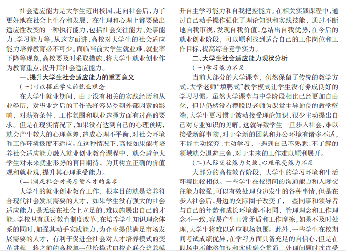 在经济全球化的影响下,各国为了在国际地位中占有一席之地,逐渐从之前的经济竞争、军事竞争转变为 文化的竞争、人才的竞争,这种竞争方式的变化直接影响了我国现阶段的教育体系,在国家全面鼓励素质教育的当下, 如何培养适应时代发展和变化的人才成为高校教育的重中之重。基于此,本文以提升大学生社会适应能力为导向,探 索就业创业教育具体策略。
