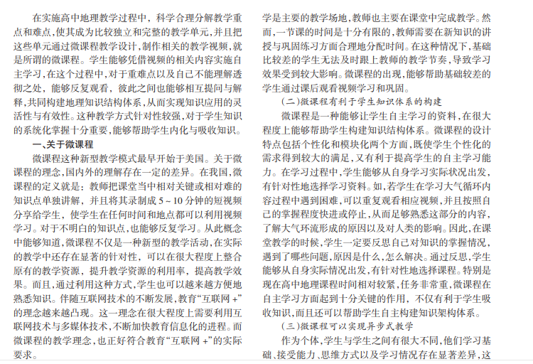 高中地理学科通过以人地关系为中心,阐述了越来越多的基础知识,重点培养学生的地理思维训练与学 习能力。因此,在高中地理学习过程中,需要详细构建地理知识框架,强调掌握重点和难点,同时还必须从知识练习出 发,建立相应的思维线索,加强知识实践。由此可见,高中地理课堂教学若继续采取传统填鸭式教学,效果将无法达到教 学大纲相关要求。本文尝试把微课程引入高中地理课堂教学,并研究其辅助教学的有效性,与教育同行一起探讨分享。