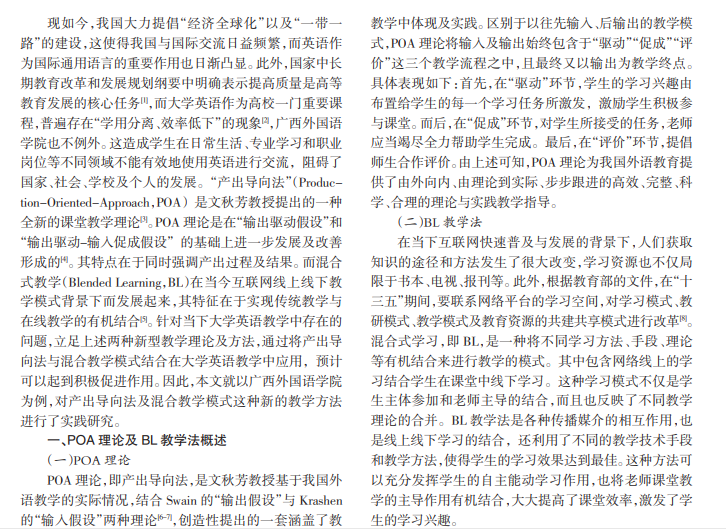 本文结合产出导向法理论以及混合教学的特点,以广西外国语学院为例,对该新型教学模式进行了实践。 研究表明,基于产出导向法的大学英语混合教学模式在一定程度上改善了大学英语的教学质量,为解决“学用分离,费 时低效”的英语教学问题提供了新的思路。