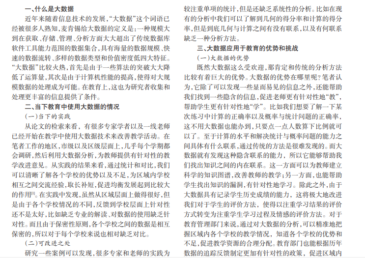随着信息技术的发展,大数据的使用逐步渗透到了我们生活的方方面面。近年来,越来越多的专家和一线 老师开始了使用大数据来改善教学的尝试,为我们提供了宝贵的经验。结合大数据以及学校教育的特点,如果科学地 使用,在教学方面可以极大地帮助老师更有针对性地“教”,促进学生更有针对性地“学”。