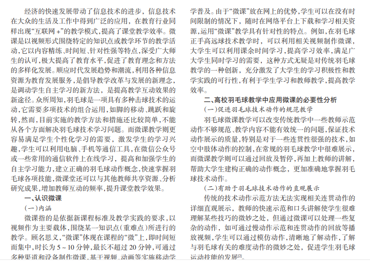 微课作为一种新型的教学资源和手段,对提高高校教学效果具有重要意义。高校羽毛球选修课引入微课 教学,有利于大学生掌握羽毛球技术,能有效提高高校羽毛球选修课的教学效果。本文结合多年的羽毛球教学经验,分 析微课应用于高校羽毛球教学的必要性,科学设计羽毛球微课内容,并将其与传统课堂教学相结合,使学生能够主动发 现问题并最终解决问题,为提升高校羽毛球教学效果提供有益参考。