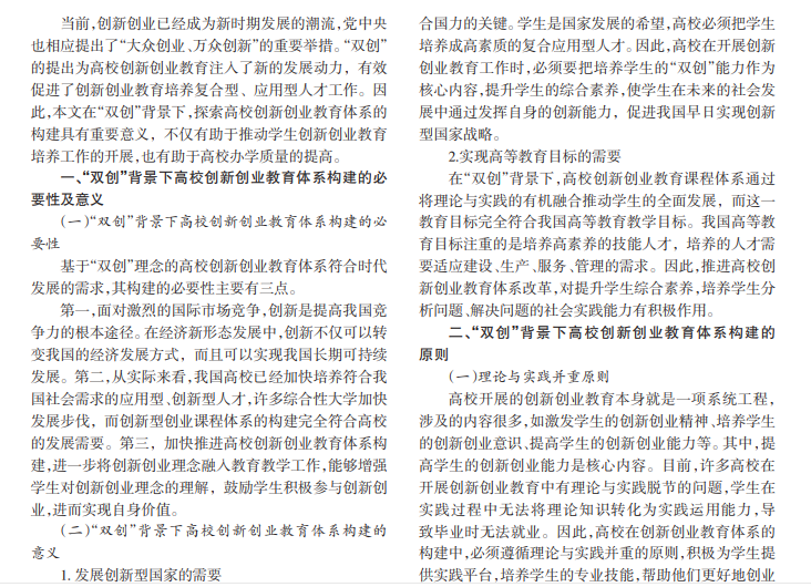 基于“双创”背景,高校创新创业教育体系是高校创新创业教育的重要组成部分。本文通过分析“双创”背 景下高校创新创业教育体系构建的必要性及意义,探究这一体系构建需要遵循的原则,并提出构建策略,以期为创新创 业教育深化改革提供参考意义。