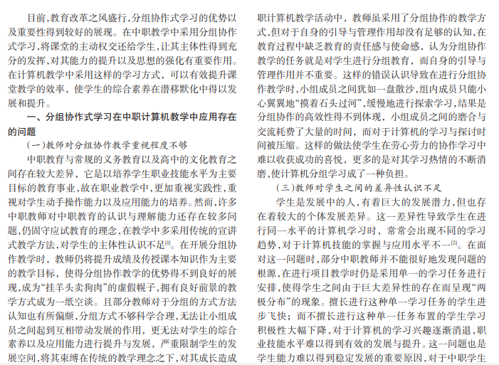 分组协作式学习是素质教育理论下广受青睐的一种教学手段,是学生主观能动性的重要体现。在教学活 动中,采用分组协作的方式能够有效提升学生的学习效率,强化他们的认知水平。在中职计算机教学中采用分组协作 的学习方式,可以使学生的操作能力与应用意识得到较好的发展与提升。本文对分组协作式学习在中职计算机教学中 的应用进行了探析。