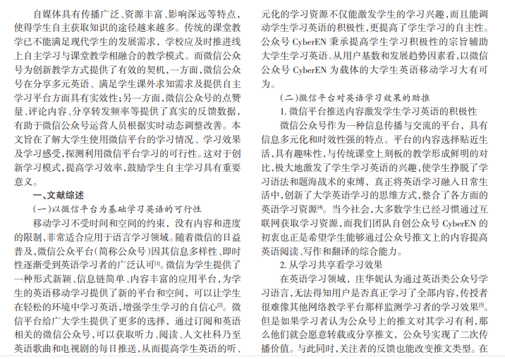 社交网络的普及极大地推动了移动学习的发展。而微信公众号平台更是实现了文字、图片、视频等信息文 化的快速传播和分享。各种类型的英语微信公众号为大学生提供了大量的英语学习资源,突破了时间与空间的限制。大 学生使用微信平台学习英语的效果如何是值得探讨和思考的。本次调查采用观察法、访谈法、问卷调查法,以团队自创 的英语类微信公众号 CyberEN为例,调查分析大学生使用微信公众号学习英语的效果。