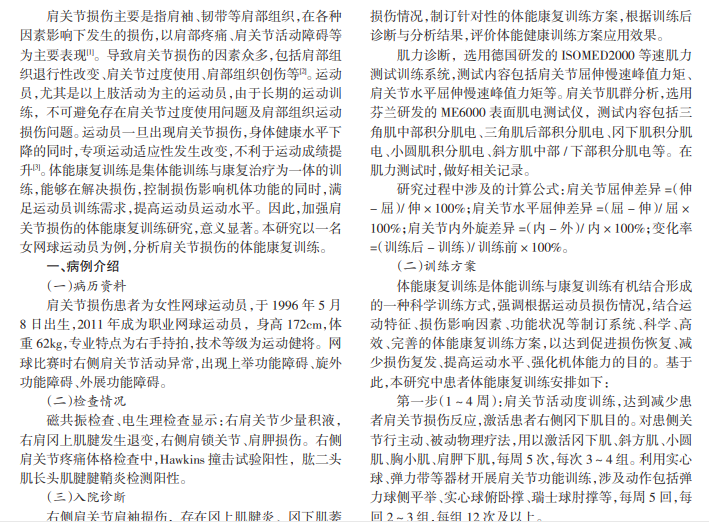 肩关节损伤是运动员常见的损伤,根据运动员肩关节损伤实际情况,为其制订针对性、系统性体能康复训 练方案,能够有效改善患者伤情,促进患者运动水平、健康水平提升,本文对肩关节损伤体能康复训练进行探究,以期为 构建完善、科学的训练体系提供帮助。
