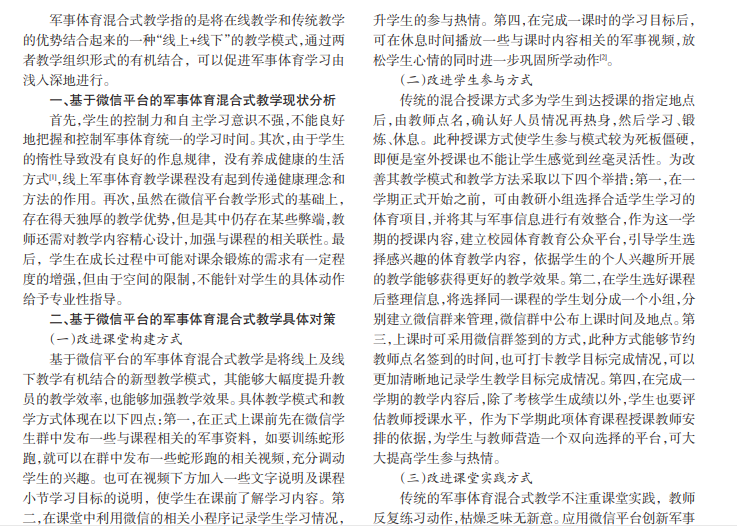 军事体育应用微信平台实施混合式教学有利于提高学生学习的积极性和自主性,深入对学习的探索,拓 宽教学展示平台。分析混合式教学现状,提出改进课堂构建方式、改进学生参与方式、改进课堂实践方式等有效教学对 策,有利于增强学生的身心健康,提高学生体质,为我国混合教育教学事业发展奠定基础。
