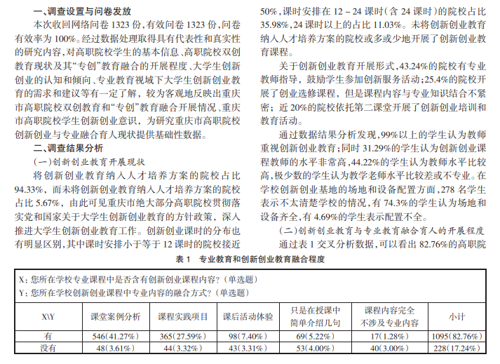 创新创业教育与专业教育有机融合,是新时代提升人才培养质量的重要途径。运用问卷调查法,对高职院 校创新创业教育与专业教育融合育人的现状展开调研,对重庆市高职院校创新创业教育现状以及“专创”教育融合的 开展程度、高职院校大学生创新创业的认知和倾向等方面进行分析和归纳,提出专业教育视域下大学生创新创业教育 的需求和建议。