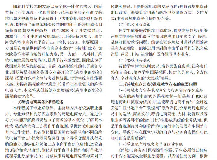 《跨境电商实务》是高职财经商贸大类开设的一门专业课,知识涉及面广,相关知识多,实操性强。在教学 过程中,发现教材与岗位要求差距大、缺乏平台账号,师资业务经验不足等实际问题。针对上述情况,文章从创新创业的 角度探索《跨境电商实务》课程的教学改革,以期培养符合行业和企业需求的跨境电商人才。