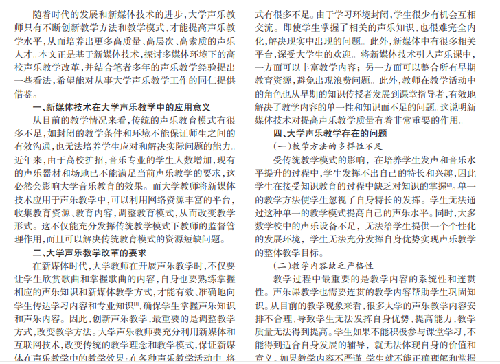 在信息技术快速发展的今天,网络技术已被应用于教学中。面对传统教育模式的单一性、重复性等问题, 大学教师在开展声乐教学时应该积极应用新媒体技术,使学生获得知识的方式呈现多样化特点,从而提高教学质量。 本文分析了大学声乐教学的现状,并结合其实际要求,提出了将新媒体应用于声乐教学的策略。