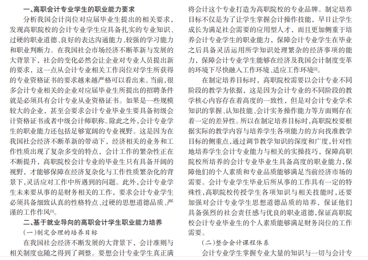 在我国社会经济不断发展的大背景下,会计工作岗位与相关制度也出现了多元化的发展趋势,对高职院 校会计专业学生的职业能力提出了更高的要求。但是当前部分高职院校在会计专业相关教学中,还存在着“重理论,轻 实践”“重技能,轻素质”等问题,导致高职院校会计专业的毕业学生无法满足当前会计岗位的需要。因此,高职院校要 基于就业导向,重视培养会计专业学生的职业能力。