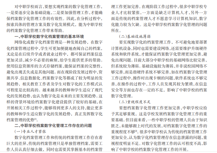 在现代社会发展的过程中,各个组织单位之间开展档案管理工作有助于收集信息,有利于资源共享,保证 其内部的工作更加合理。对于中职学而言,开展档案管理工作更具有一定的现实意义。在此背景下,本文主要研究了中 职学校数字化档案管理的基本环境,分析了目前数字化档案管理工作存在的问题,并针对性地提出解决措施,希望能 提高中职学校档案数字化管理工作的有效性。