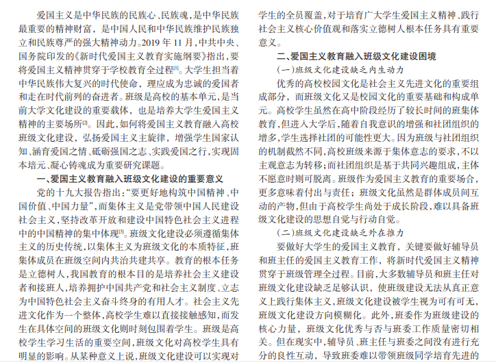 爱国主义教育是学生思想政治教育的重要内容,班级文化建设是践行社会主义核心价值观的微观呈现。 本文通过阐释爱国主义教育融入高校班级文化建设的重要意义,分析了班级文化建设面临的现实困境,探究了爱国主 义教育融入高校班级文化建设的有效路径,为高校强化爱国主义教育,优化班级文化建设方法提供借鉴意义。