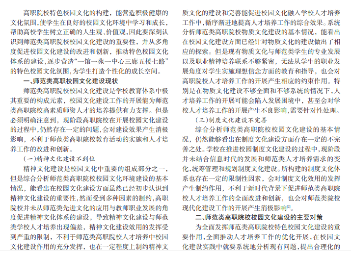 高职院校校园文化建设是学校教育的组成部分,师范类高职院校要想培养高素质人才,就要充分认识到 特色校园文化建设的重要性,并将特色校园文化建设作为基础推动高技能型师范类人才的有效培养。本文全面分析师 范类高职院校校园文化建设的现状,结合当前建设过程中存在的问题,提出了有效促进师范类高职院校校园文化建设 的措施,希望能为师范类院校人才培养工作的开展提供良好的支持。