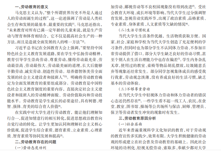 劳动教育作为高校开展思想政治教育的重要载体,对于教育引导广大学生崇尚劳动、尊重劳动,懂得劳动 最光荣、劳动最崇高、劳动最伟大、劳动最美丽的道理,落实全国教育大会的精神具有重要的意义。本文从高校大学生劳 动教育存在的问题入手,结合办学特色对学生进行思想教育,提升学生的综合素质。通过示范引领、制定学分、主题实 践、建立基地等四个途径开展了实践探索。