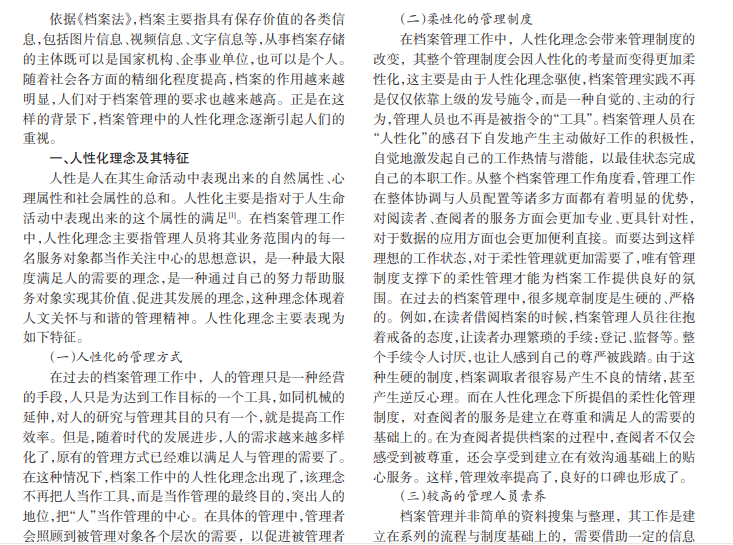 人性化理念主要指管理人员把其业务范围内的每一名服务对象都当作关注中心的思想意识,是一种最大 限度满足人的需要的理念。以人性化理念管理档案应从树立全新的管理理念、激发管理人员的潜能等方面入手。