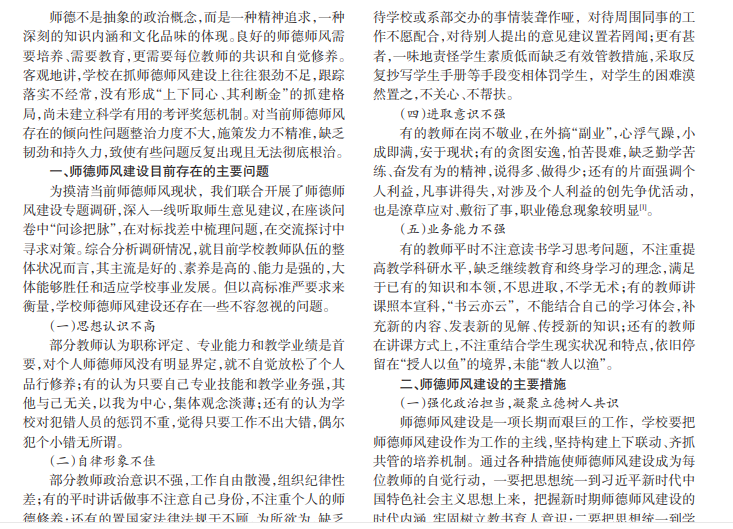 师德师风建设是一项长期而艰巨的任务,由于狠劲不足,措施不到位,仍然存在很多普遍性问题。因此,加 强师德师风建设迫在眉睫,这不仅是当下学校发展的需要,更是教师自身发展的需要。加强师德师风建设不仅是领导层 面的事,更需要全体教职工的共同参与,大家只有形成一盘棋,拧成一股绳,心往一处想,劲往一处使,方能有突破。