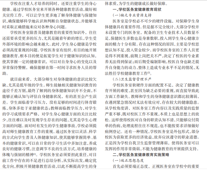 医务室是学校不可或缺的组成机构,在健康教育方面更是发挥着至关重要的作用,对于指导学生养成良 好的健康行为以及生活方式意义重大。但就目前来看,很多学校对医务室的责任划分比较模糊,相关医务人员的专业 水平也无法保证,大大影响了学校健康教育工作开展的成效。随着时代的发展和社会的进步,健康问题越来越被全社 会关注和重视,这就要求学校进一步提高对医务室工作建设与管理的重视,以科学合理的形式来促进健康教育活动的 有效进行。