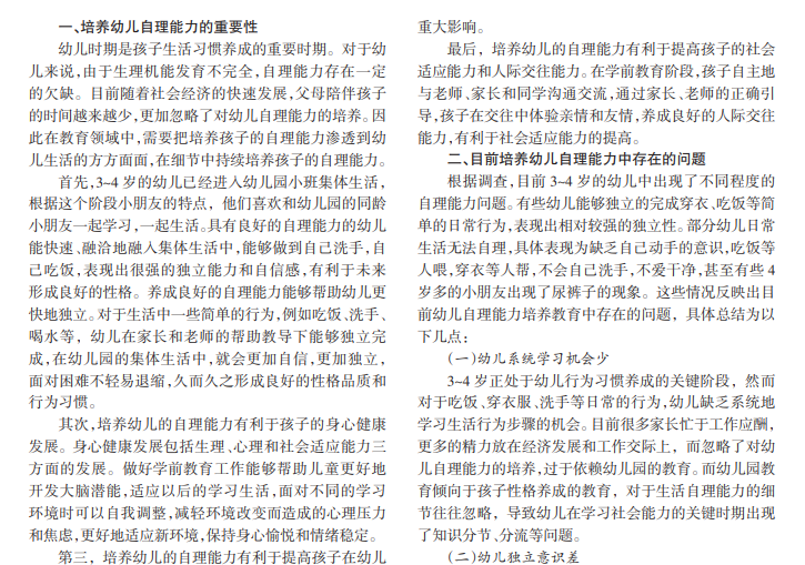 幼儿的教育问题一直是家长、老师和社会关注的重点。近年来随着我国教育事业的快速发展,社会各界以 及家长对学前教育的要求越来越高,学前教育问题受到越来越多的重视。幼儿自理能力的培养不仅影响到儿童的身心 发展,对儿童未来的发展也至关重要。有关教育人员、家长、社会应该密切关注幼儿自理能力的培养,结合幼儿的身心 特点开展教育工作。本文简要分析培养幼儿自理能力的重要性以及教育现状,并提出了相应的优化策略。