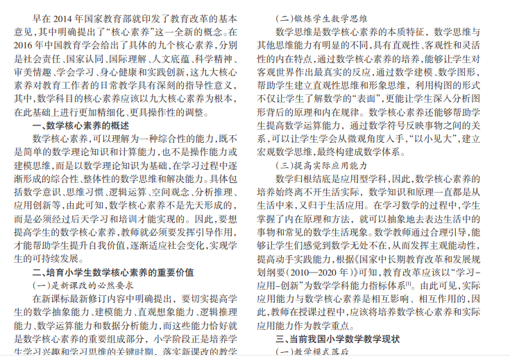 在我国当前的教学体系中,数学科目一直占据着重要的地位,是人们生活、劳动和工作中必不可少的重要 工具,不仅能够帮助人们处理数据、推理计算、构建模型,还能深入分析事物之间的内在规律,总结自然规律和社会现 象。在国家新课改的大背景下,国家教育部门越来越重视学生核心素养的培育,但是当前小学数学教学过程中仍然存 在一些问题,本文针对这些问题,提出改革方案,探索培养小学生数学核心素养的新路径。