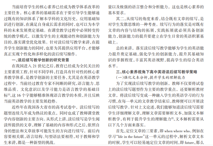 在当前的高中英语教学中,为了进一步提升学生的英语综合素养,读后续写已经成为基础的教学内容,但 是在落实读后续写教学的过程中,大部分学生还未能掌握基础技巧,导致读后续写过程较为形式化,千篇一律的现 象时有发生。因此,文章建立在核心思想基础上,分析高中课堂英语读后续写的相关落实策略,从文章内容、语言风 格、创新能力以及情节积累这四个方面展开论述,旨在通过本文的分析,为当前高中英语读后续写的有效落实提供相 关策略。