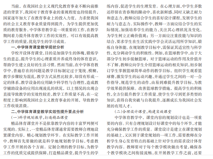 在中学体育教学中,为了有效提升教学工作的实效性,需要教师对当前体育教学工作的现状做出系统性 的分析与探索,针对现状规划教学方案,确保我国中学体育教学工作质量逐步提升,为我国社会主义建设事业培养出更 多综合型的人才。
