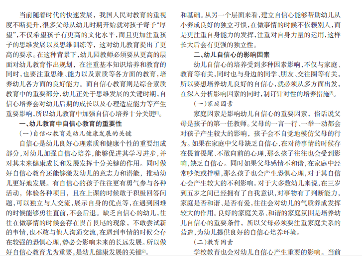 幼儿教育中加强自信心培养,有助于幼儿形成正确的人生观、价值观和世界观,促进幼儿良好发展。但是 当前我国很多幼儿教师在实际教育中不注重自信心培养,将更多的时间花费在文化知识学习上,导致幼儿思维发展无 法受到良好引导,不利于幼儿的长远发展。基于此,本文分析研究了幼儿教育中自信心的教育方法,明确幼儿教育中自 信心培养的重要性,并结合实际情况提出一系列自信心培养的方法和措施。