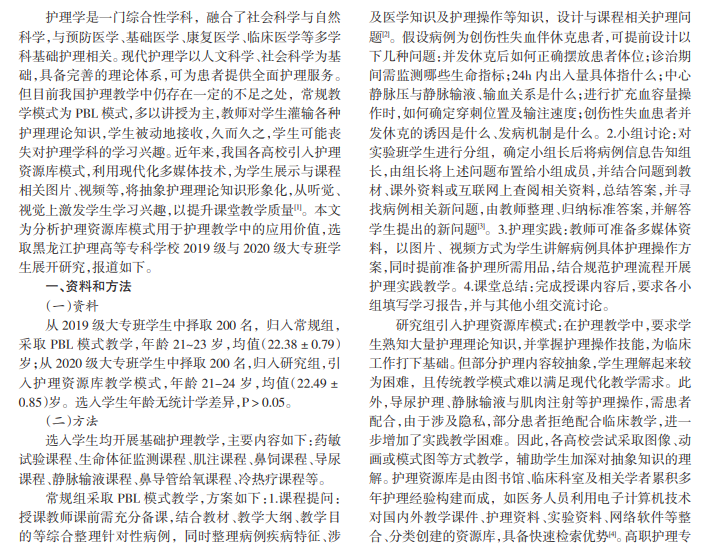 目的:研究护理教学中护理资源库模式应用及管理价值。方法:选取本校 2019级大专班学生 200名,采用 问题式方案(PBL)开展教学,归入常规组;选取本校 2020级大专班学生 200名,在 PBL教学基础上引入护理资源库教 学模式,归入研究组。分析两组教学质量及学生满意度。结果:研究组学习兴趣、团队意识与分析问题能力评分均高于 常规组,P<0.05;研究组理论考试成绩、案例分析成绩均高于常规组,P<0.05;研究组学生满意度高于常规组,P<0.05。 结论:护理教学中引入护理资源库模式,可以激发学生的学习兴趣,提升考试成绩,而且学生对护理资源库教学模式的 满意度更高,具备推广价值。