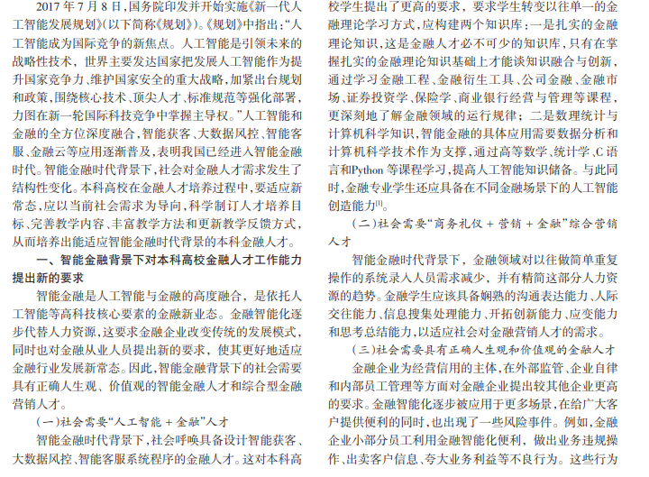 近年来,我国人工智能技术发展迅猛,被应用到金融领域当中形成了金融行业新业态。与此同时,这种新 业态也对金融从业人员的工作能力提出新的要求。作为金融人才培养基地,本科高校要以社会需求为导向,对现有的 金融人才培养模式进行改革。本文从当前金融行业对金融人才工作能力要求情况、当前本科高校金融人才培养现状及 存在问题、本科高校金融人才培养模式教学改革三个方面展开探索和研究,以期探明在智能金融背景下本科高校金融 人才培养新模式。