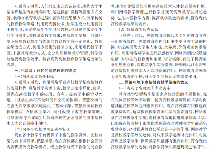 互联网 +时代,高校传统的教育教学方式不再适合现代社会发展需要,高校人才培养方向需要与市场发 展方向一致。市场对人才需求发生转变,高校的教育教学策略需要转变。高校的教育教学目标是为现代企业发展培养应 用型高级技术人才。高校应根据社会发展需要,积极进行教学改革,为现代社会发展培养应用型高级技术人才。本文从不 同方面阐述互联网 +时代的高校教育教学策略研究,希望为研究高校教育教学策略的专家和学者提供理论参考依据。