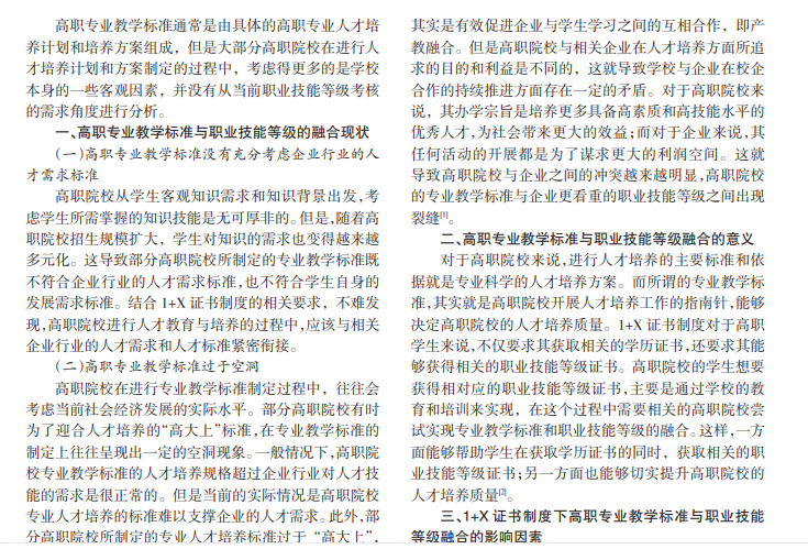 高职专业教学标准与职业技能等级的有机融合不仅关乎高职院校的长远发展,更关乎相关学生的职业发 展。本文通过简要阐述高职专业教学标准与职业技能等级融合的现状,重点阐述 1+X证书制度下高职专业教学标准与 职业技能等级的融合策略。